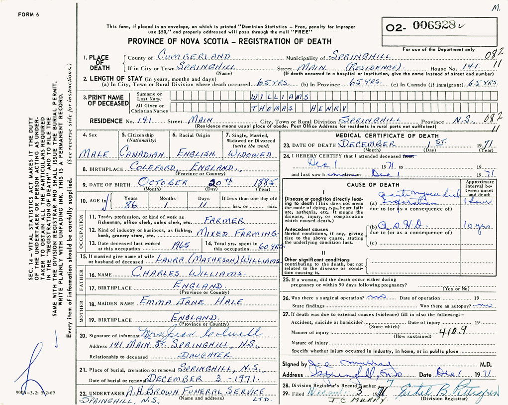 PROVINCE OF NOVA SCOTIA — REGISTRATION OF DEATH