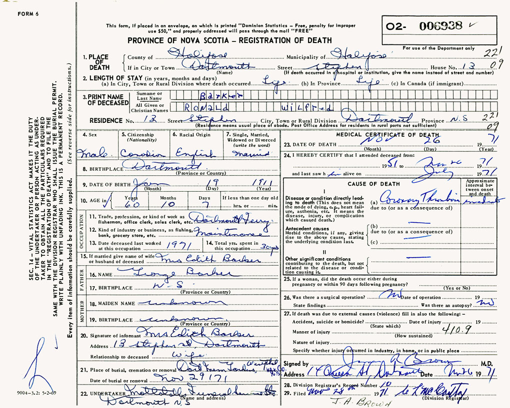 PROVINCE OF NOVA SCOTIA — REGISTRATION OF DEATH
