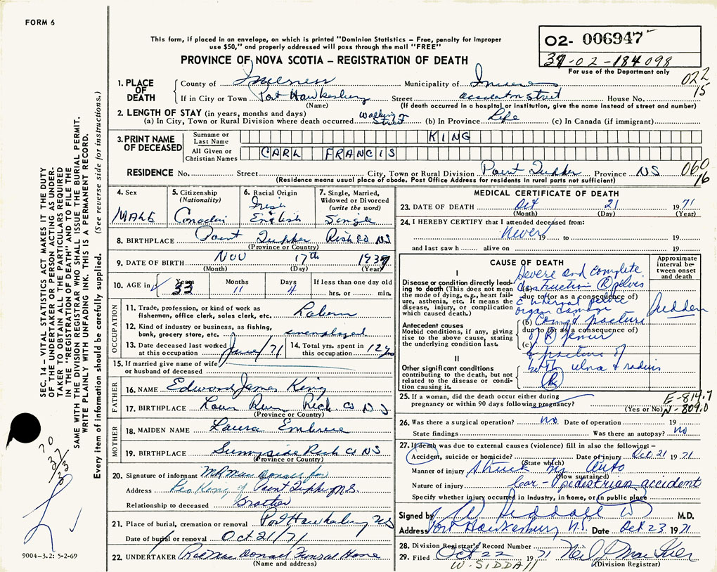 PROVINCE OF NOVA SCOTIA — REGISTRATION OF DEATH