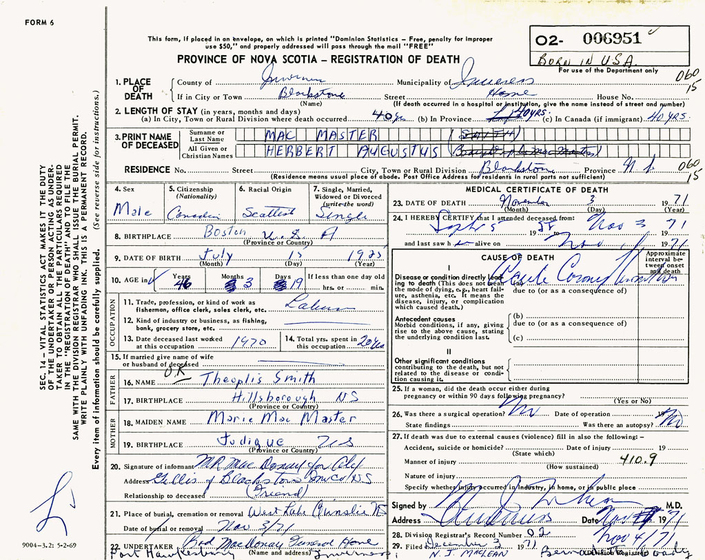 PROVINCE OF NOVA SCOTIA — REGISTRATION OF DEATH