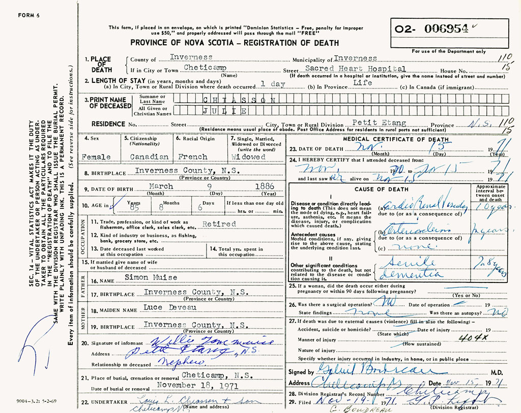 1. PLACE OF DEATH County of Inverness If in City or Town Cheticamp