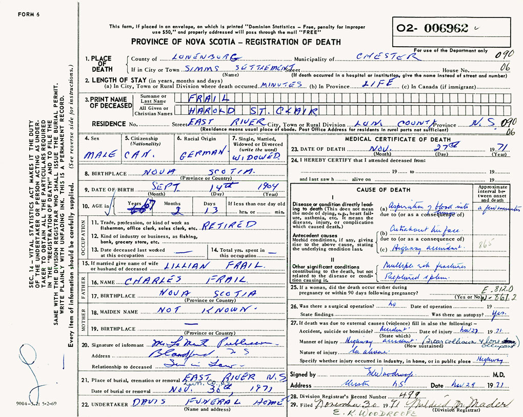 PROVINCE OF NOVA SCOTIA — REGISTRATION OF DEATH