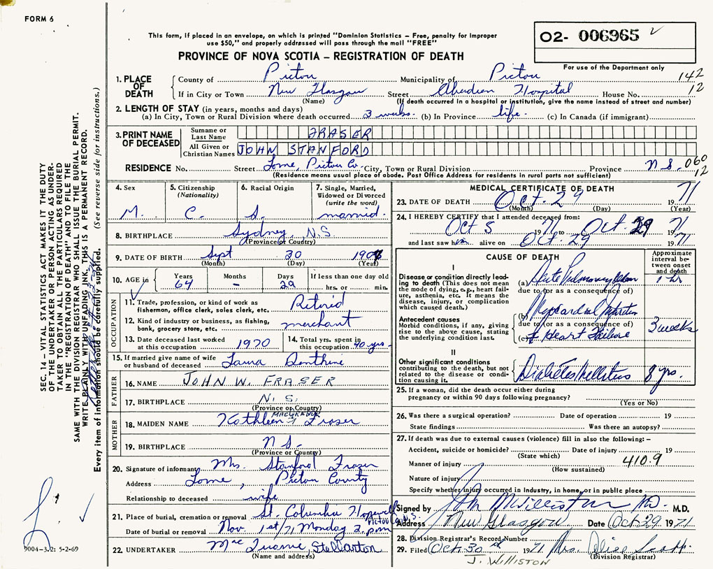 PROVINCE OF NOVA SCOTIA — REGISTRATION OF DEATH
