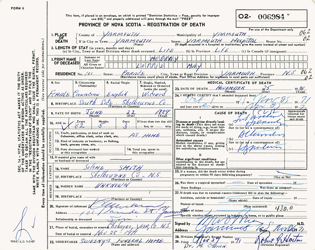 PROVINCE OF NOVA SCOTIA — REGISTRATION OF DEATH