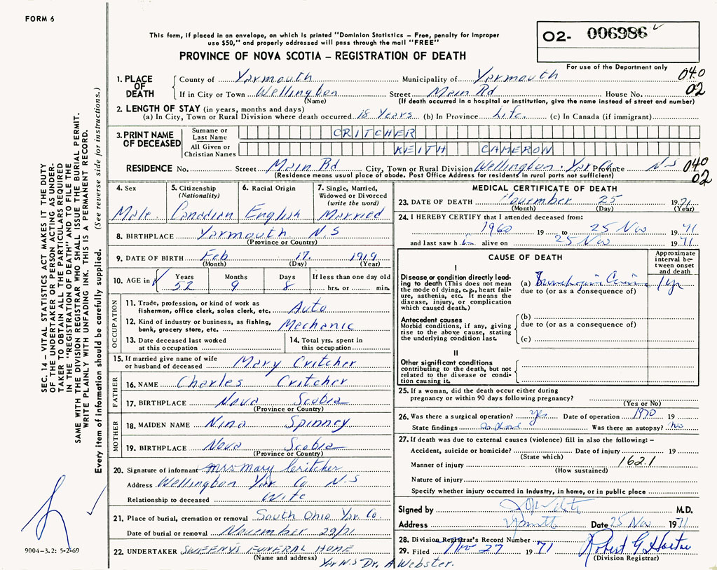 PROVINCE OF NOVA SCOTIA — REGISTRATION OF DEATH