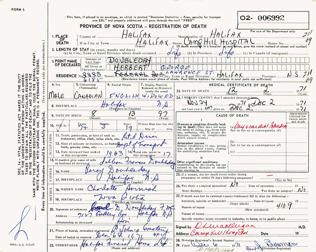 PROVINCE OF NOVA SCOTIA — REGISTRATION OF DEATH