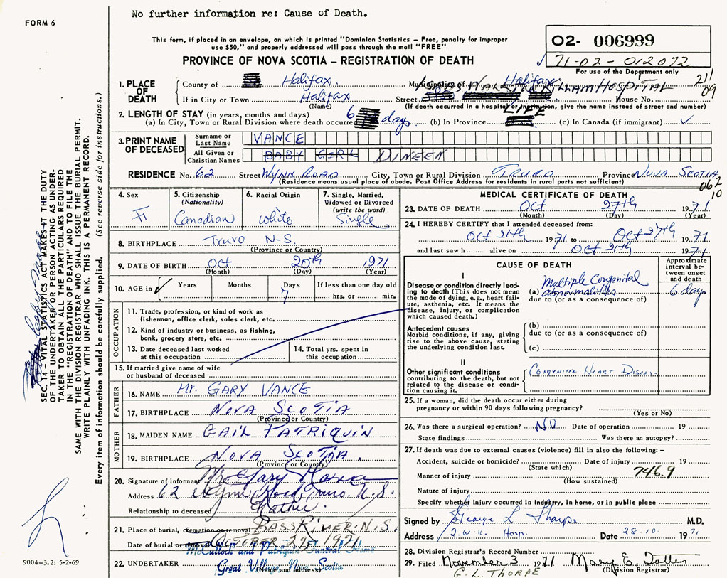 PROVINCE OF NOVA SCOTIA — REGISTRATION OF DEATH
