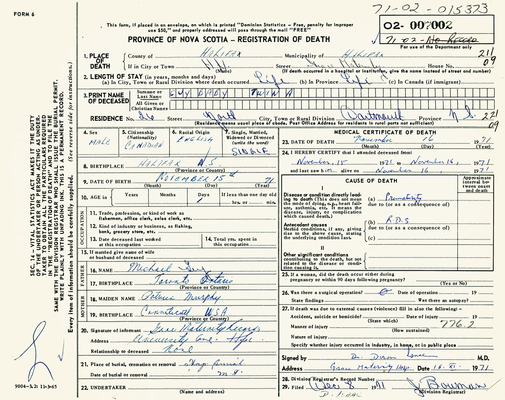 PROVINCE OF NOVA SCOTIA — REGISTRATION OF DEATH