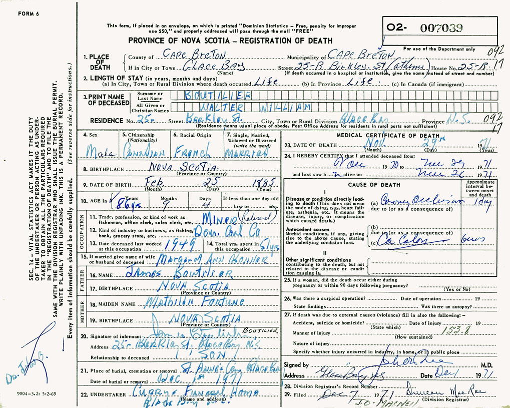 1. PLACE OF DEATH County of Cape Breton If in City or Town Glace Bay