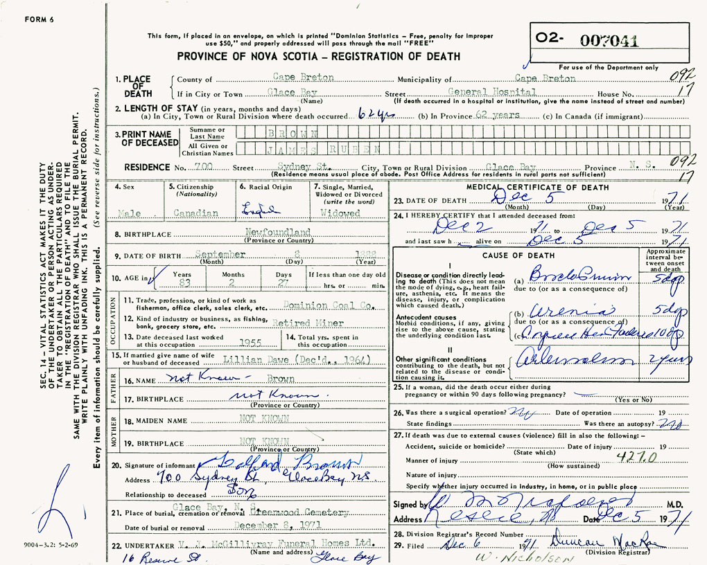 1. PLACE OF DEATH County of Cape Breton If in City or Town Glace Bay