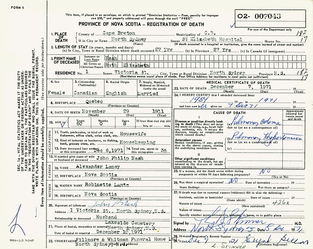 1. PLACE OF DEATH County of Cape Breton If in City or Town North Sydney