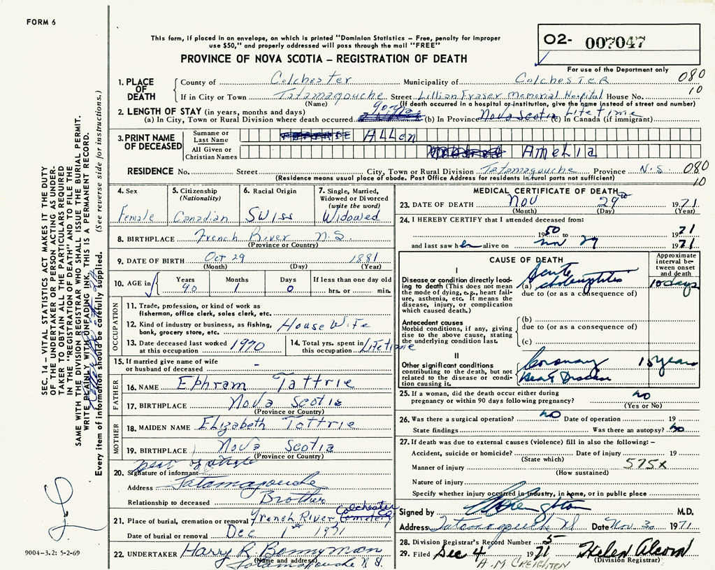 1. PLACE OF DEATH County of Colchester If in City or Town Tatamagouche