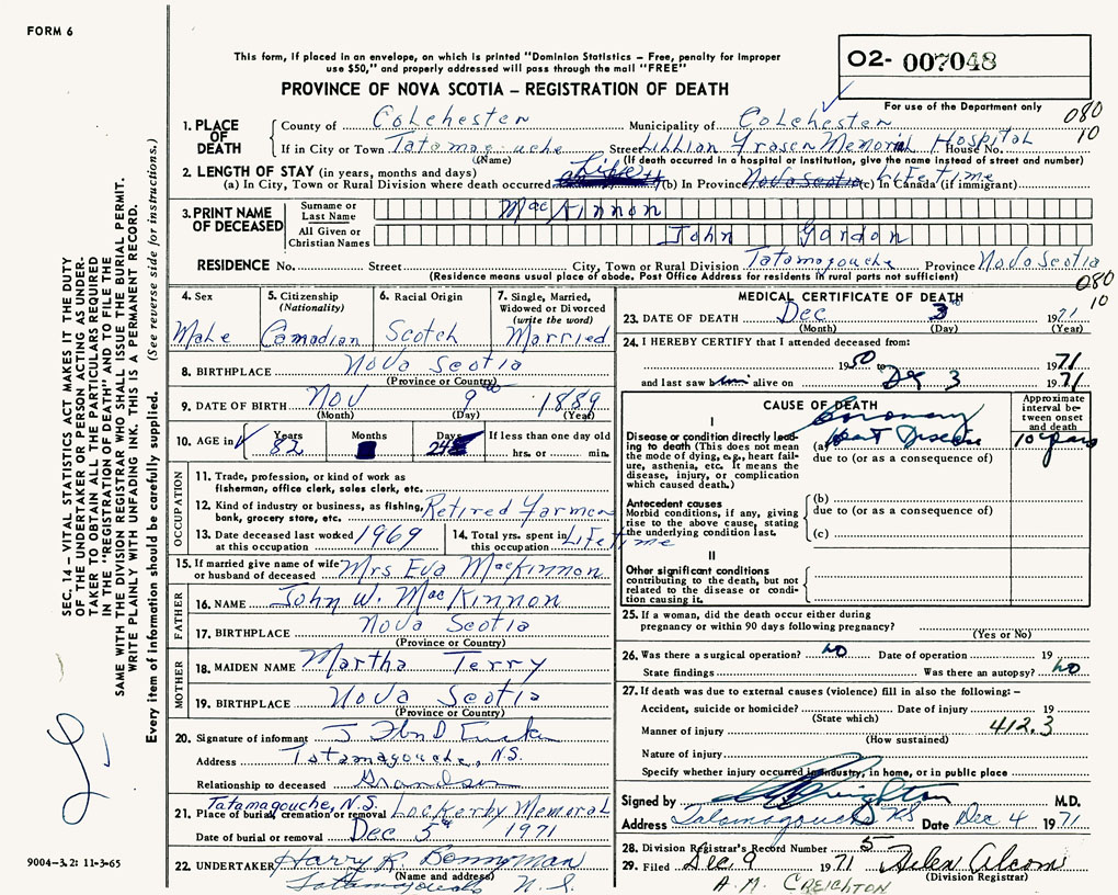 PROVINCE OF NOVA SCOTIA — REGISTRATION OF DEATH