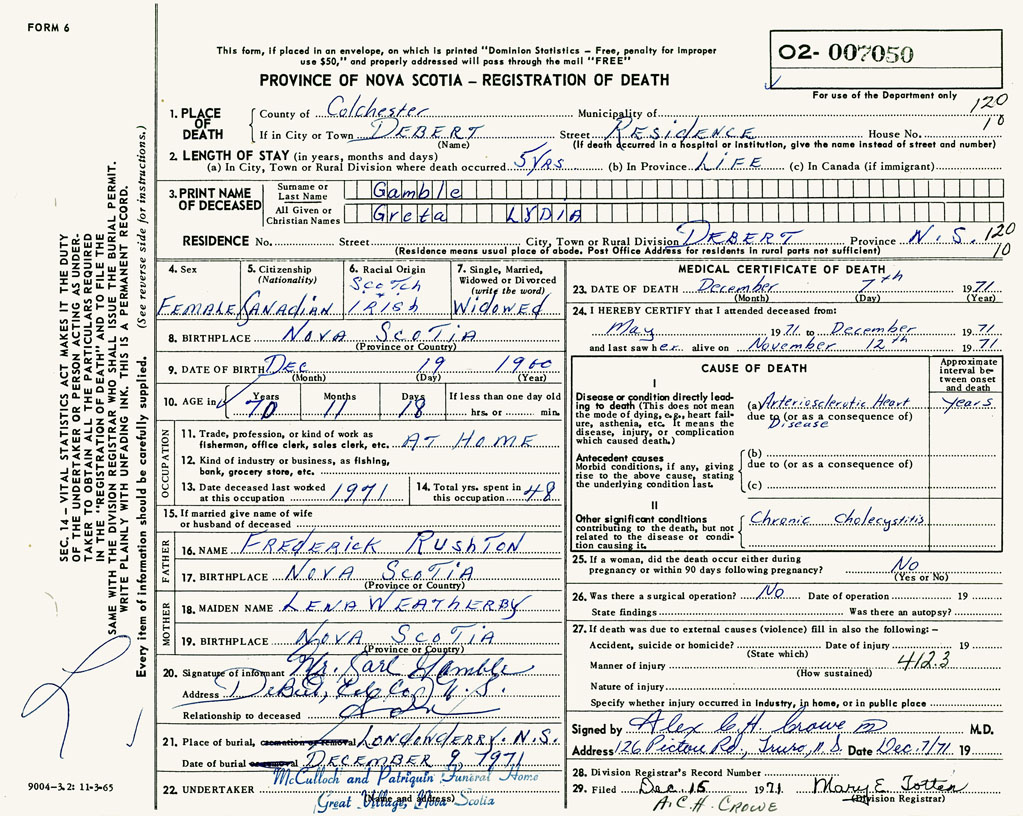 PROVINCE OF NOVA SCOTIA — REGISTRATION OF DEATH