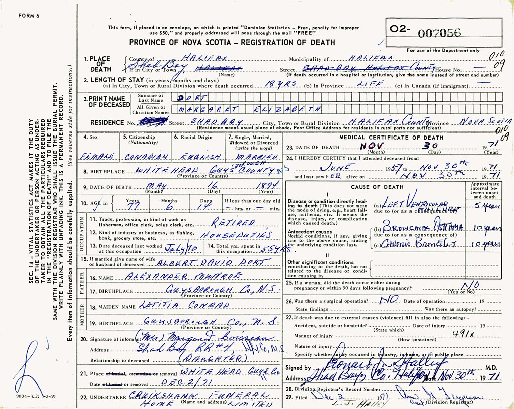 PROVINCE OF NOVA SCOTIA — REGISTRATION OF DEATH