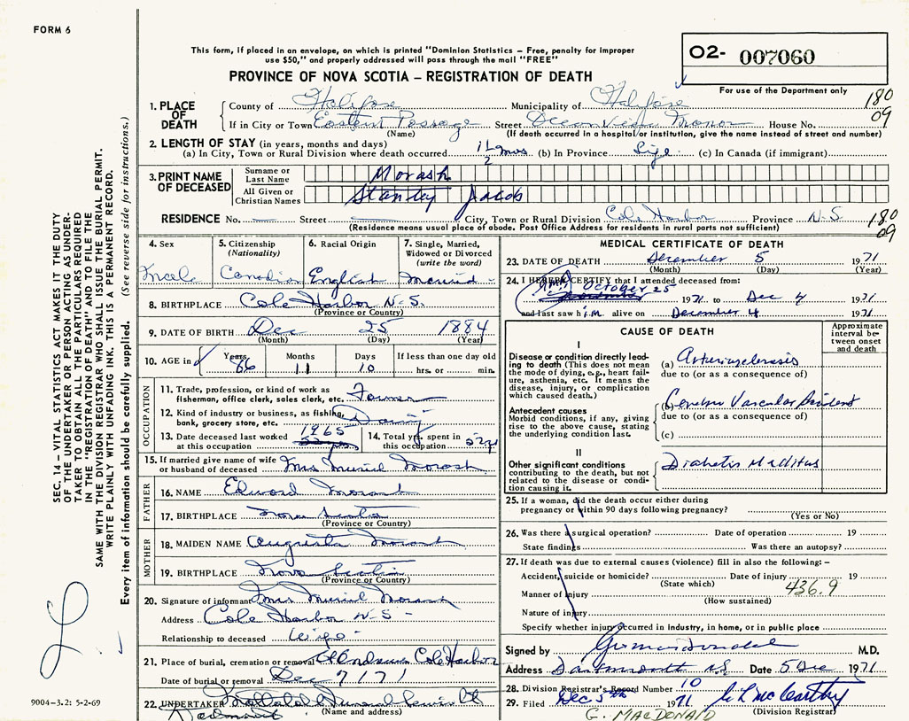 PROVINCE OF NOVA SCOTIA — REGISTRATION OF DEATH