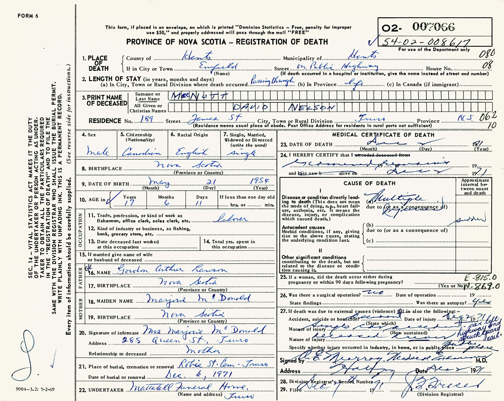 PROVINCE OF NOVA SCOTIA — REGISTRATION OF DEATH