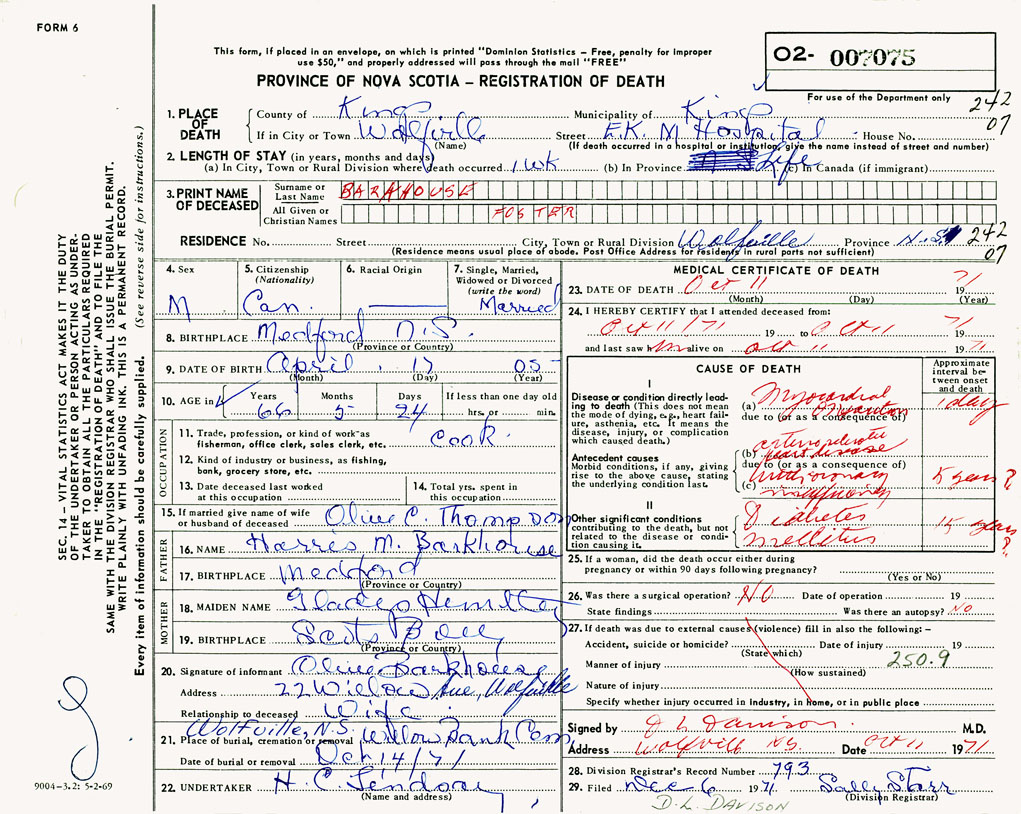 PROVINCE OF NOVA SCOTIA — REGISTRATION OF DEATH