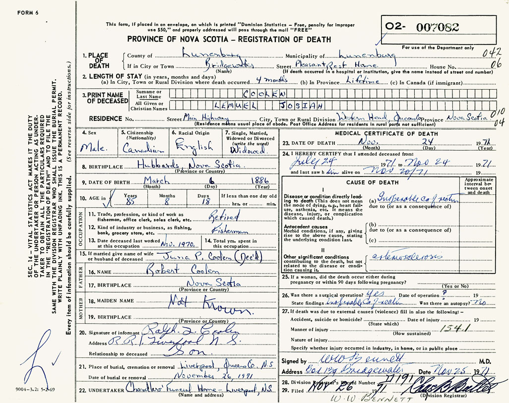 PROVINCE OF NOVA SCOTIA — REGISTRATION OF DEATH
