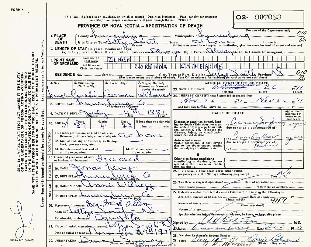 PROVINCE OF NOVA SCOTIA — REGISTRATION OF DEATH