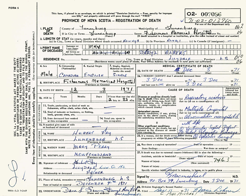 PROVINCE OF NOVA SCOTIA — REGISTRATION OF DEATH