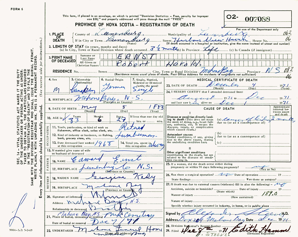 PROVINCE OF NOVA SCOTIA — REGISTRATION OF DEATH