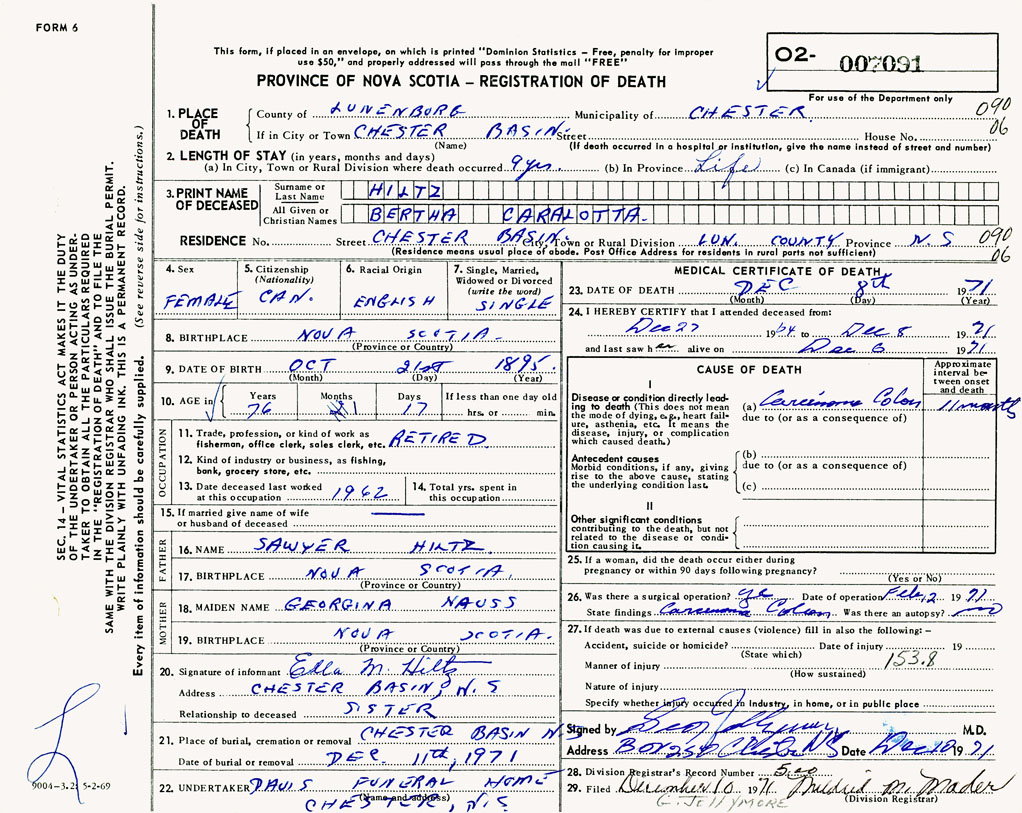 1. PLACE OF DEATH County of Lunenburg If in City or Town Chester Basin