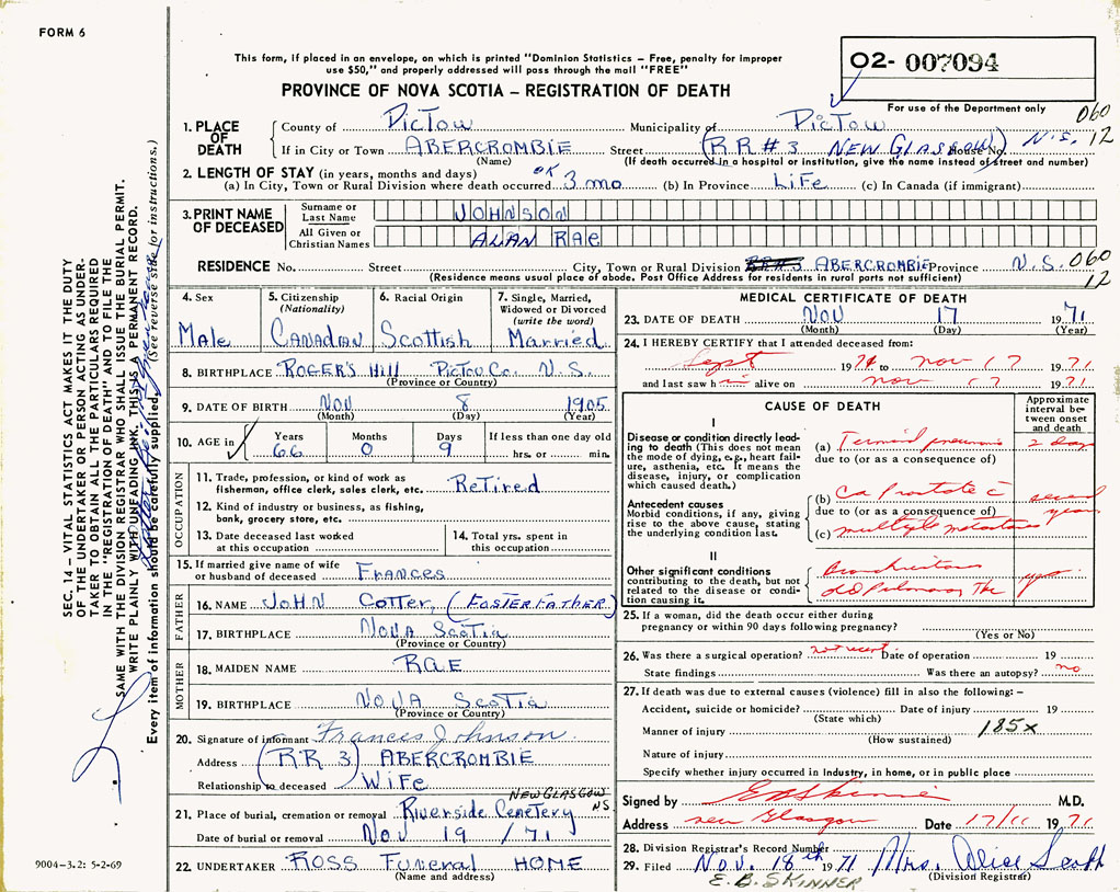 PROVINCE OF NOVA SCOTIA — REGISTRATION OF DEATH