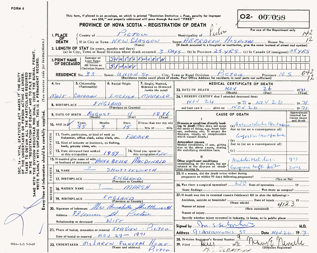 PROVINCE OF NOVA SCOTIA — REGISTRATION OF DEATH