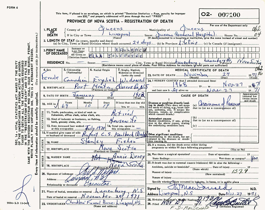 PROVINCE OF NOVA SCOTIA — REGISTRATION OF DEATH