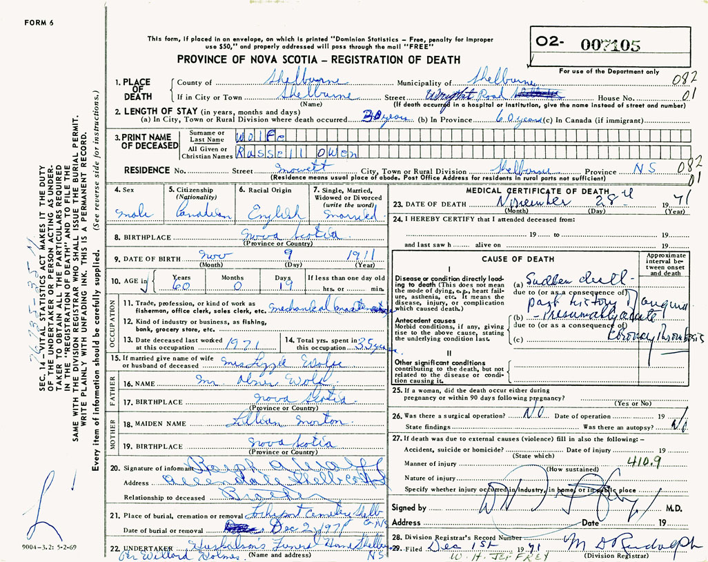 PROVINCE OF NOVA SCOTIA — REGISTRATION OF DEATH
