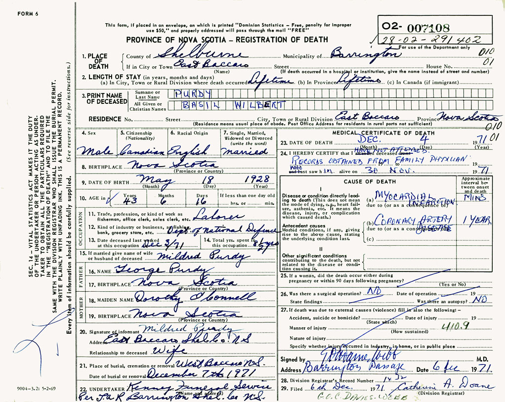 PROVINCE OF NOVA SCOTIA — REGISTRATION OF DEATH