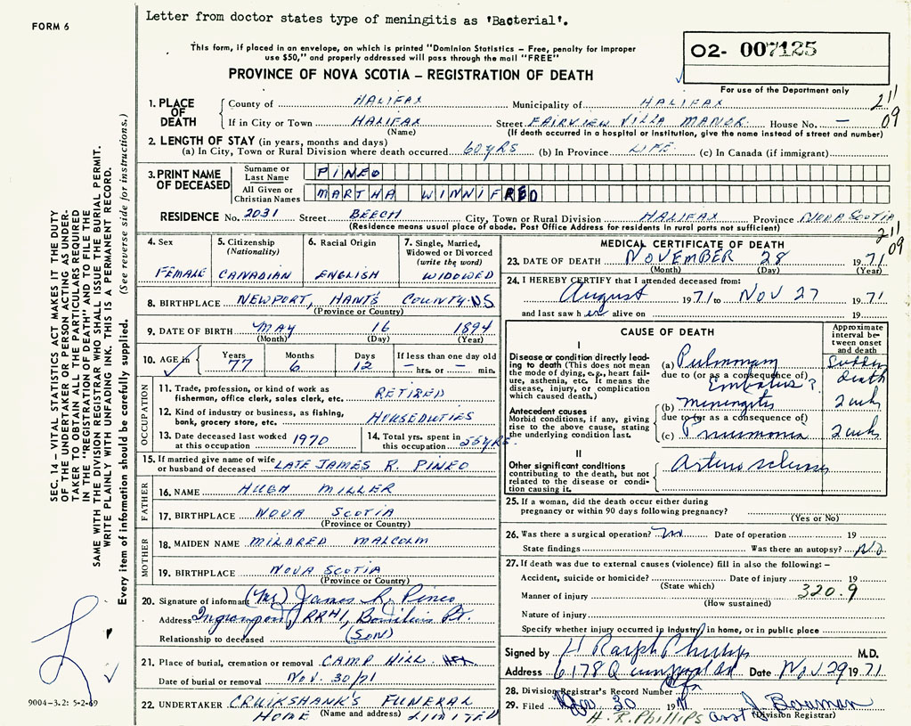 PROVINCE OF NOVA SCOTIA — REGISTRATION OF DEATH