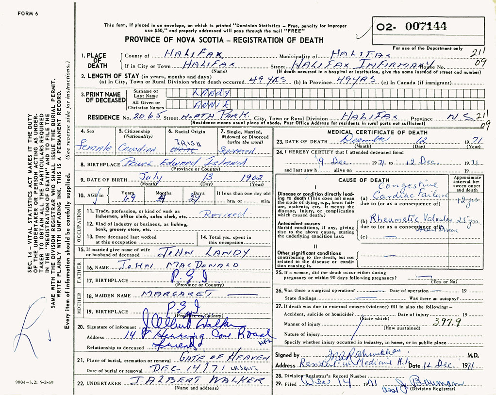 PROVINCE OF NOVA SCOTIA — REGISTRATION OF DEATH