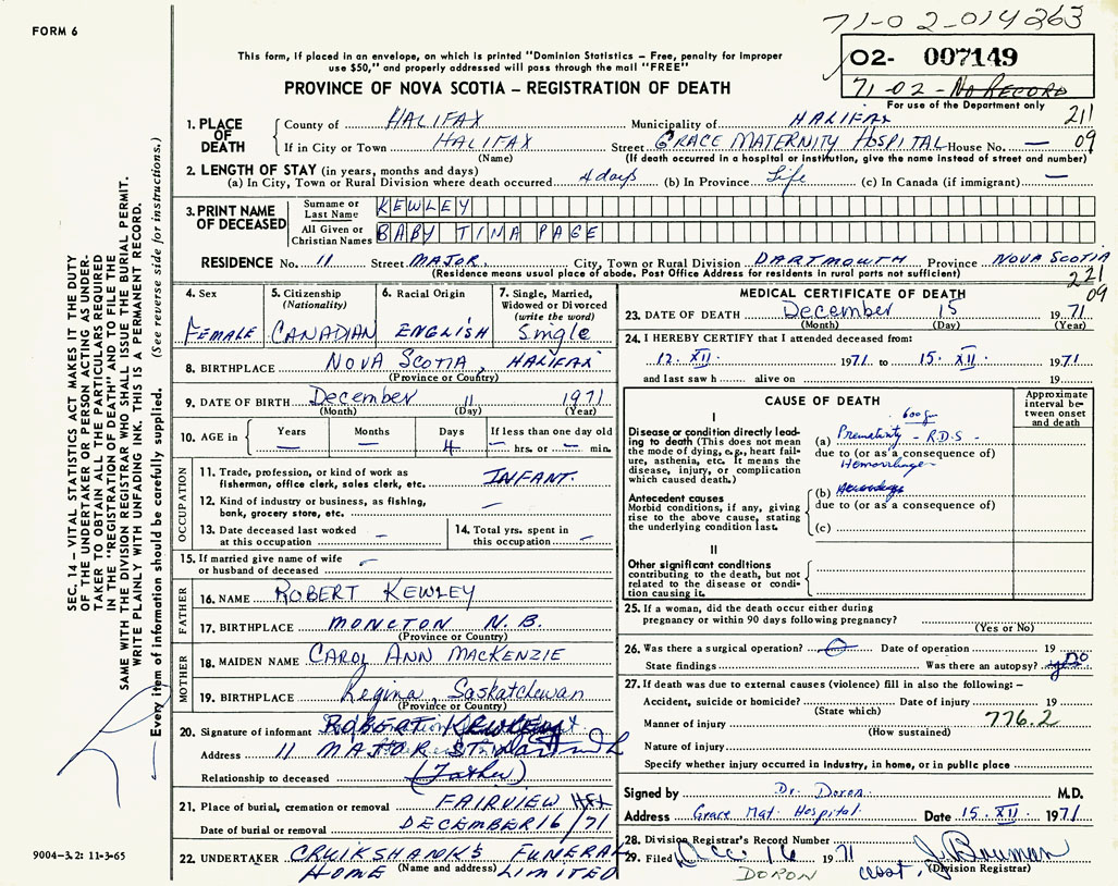 PROVINCE OF NOVA SCOTIA — REGISTRATION OF DEATH