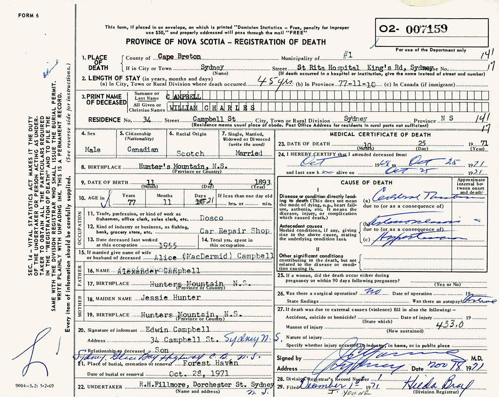 1. PLACE OF DEATH County of Cape Breton If in City or Town Sydney