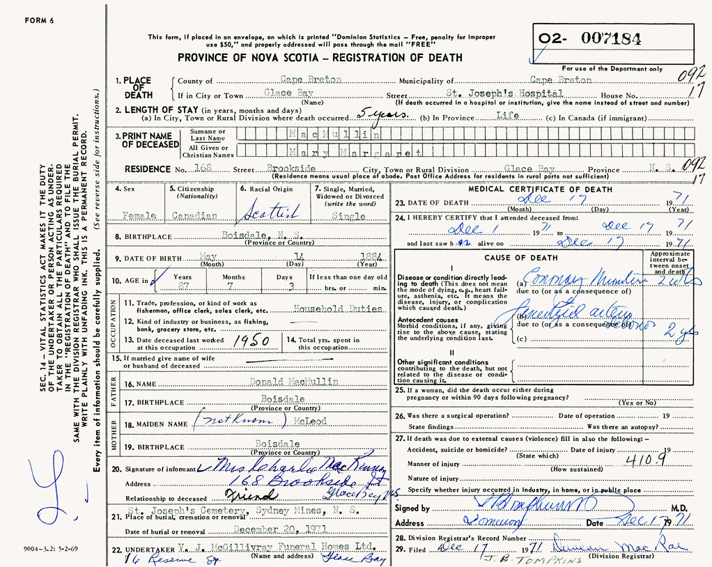1. PLACE OF DEATH County of Cape Breton If in City or Town Glace Bay