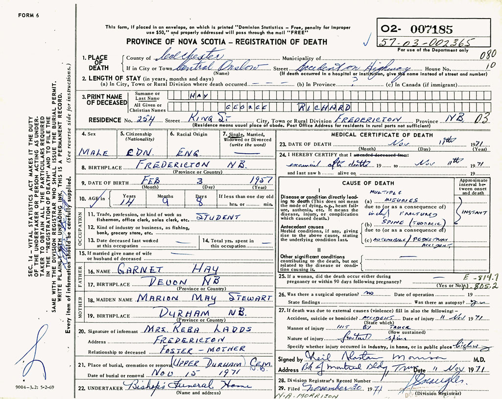 PROVINCE OF NOVA SCOTIA — REGISTRATION OF DEATH