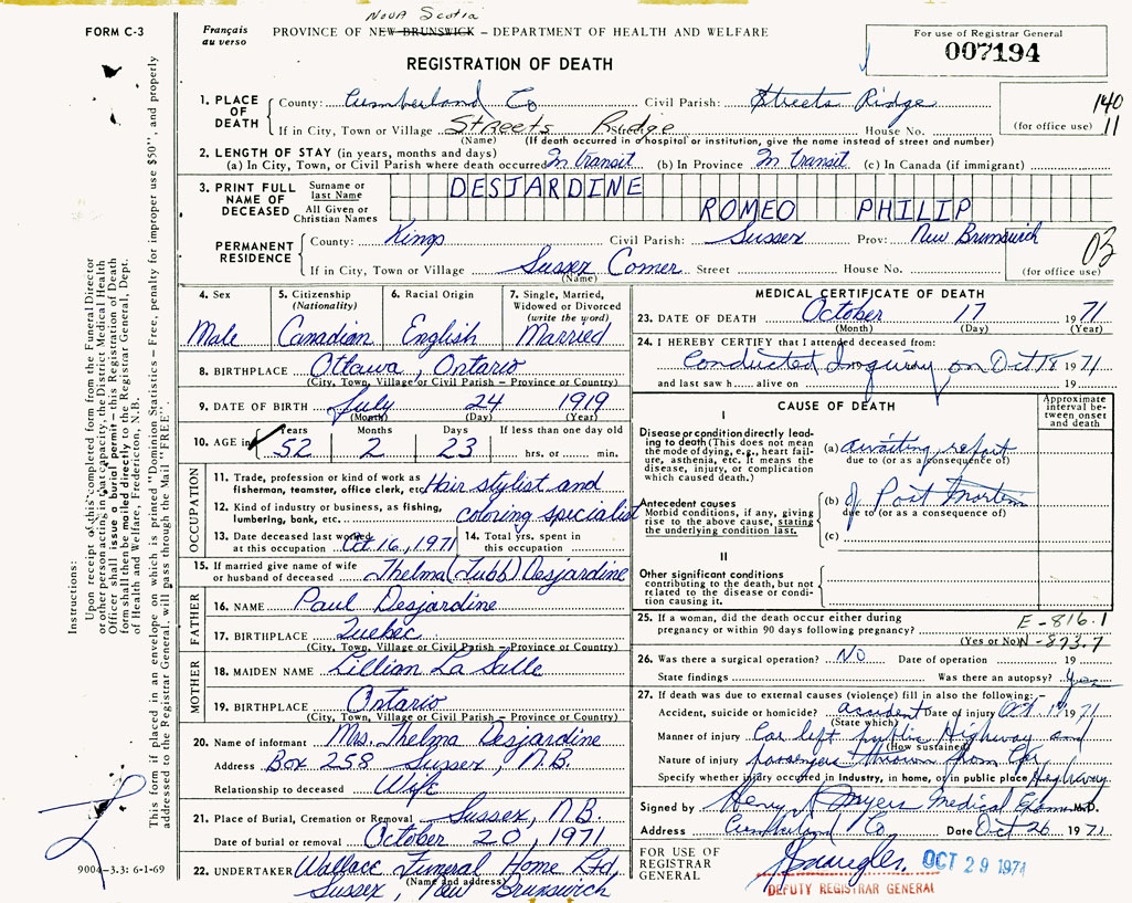 3. PRINT NAME OF DECEASED Desjardine, Romeo Philip