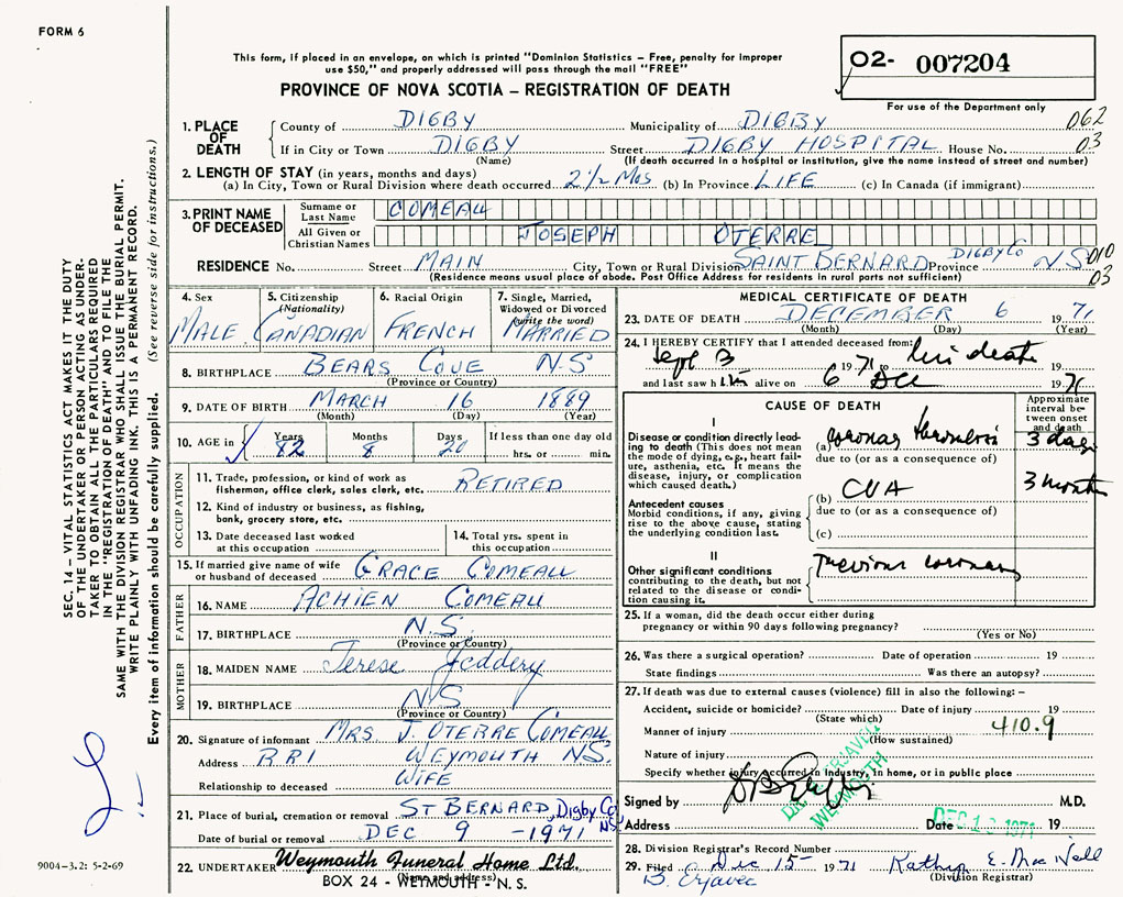 3. PRINT NAME OF DECEASED Comeau, Joseph Oterre