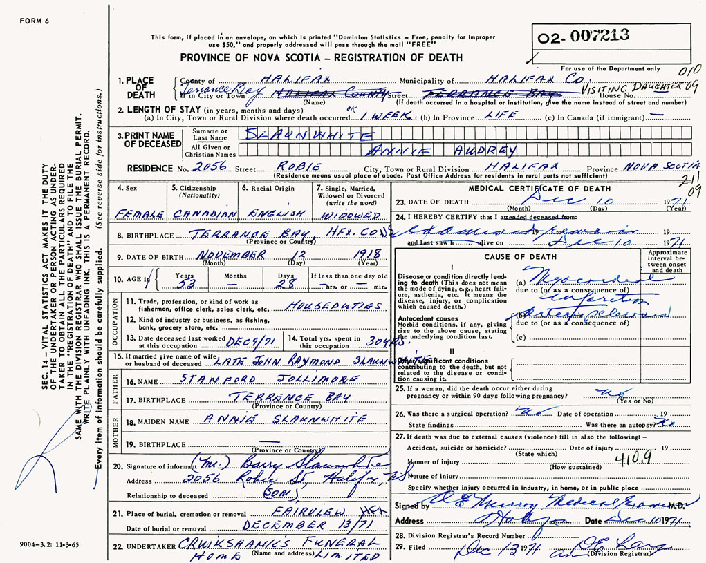 1. PLACE OF DEATH County of Halifax If in City or Town Terrance Bay
