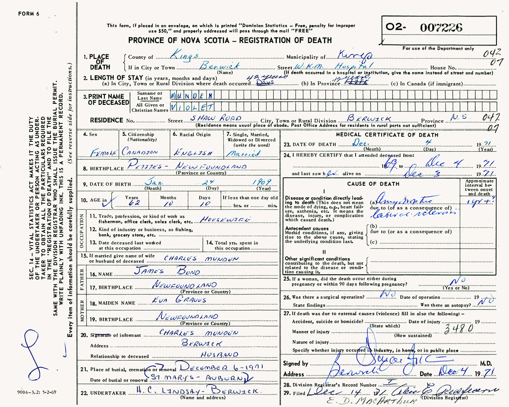 PROVINCE OF NOVA SCOTIA — REGISTRATION OF DEATH