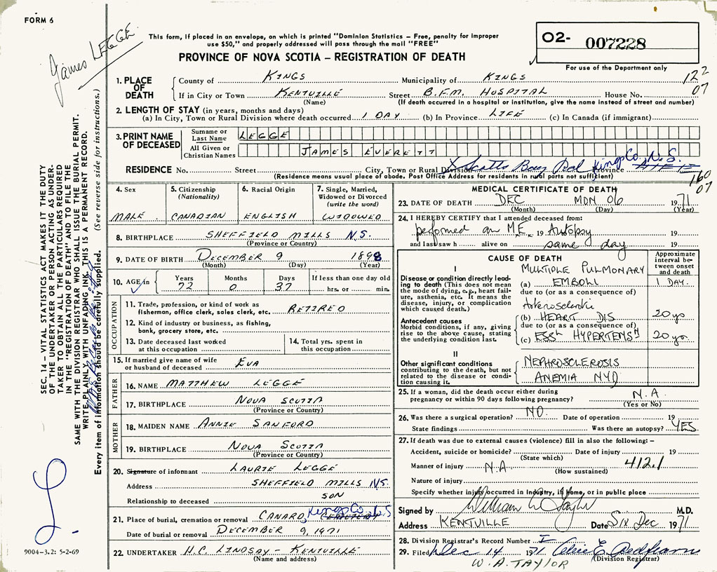 1. PLACE OF DEATH County of Kings If in City or Town Kentville