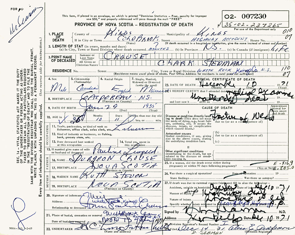 PROVINCE OF NOVA SCOTIA — REGISTRATION OF DEATH