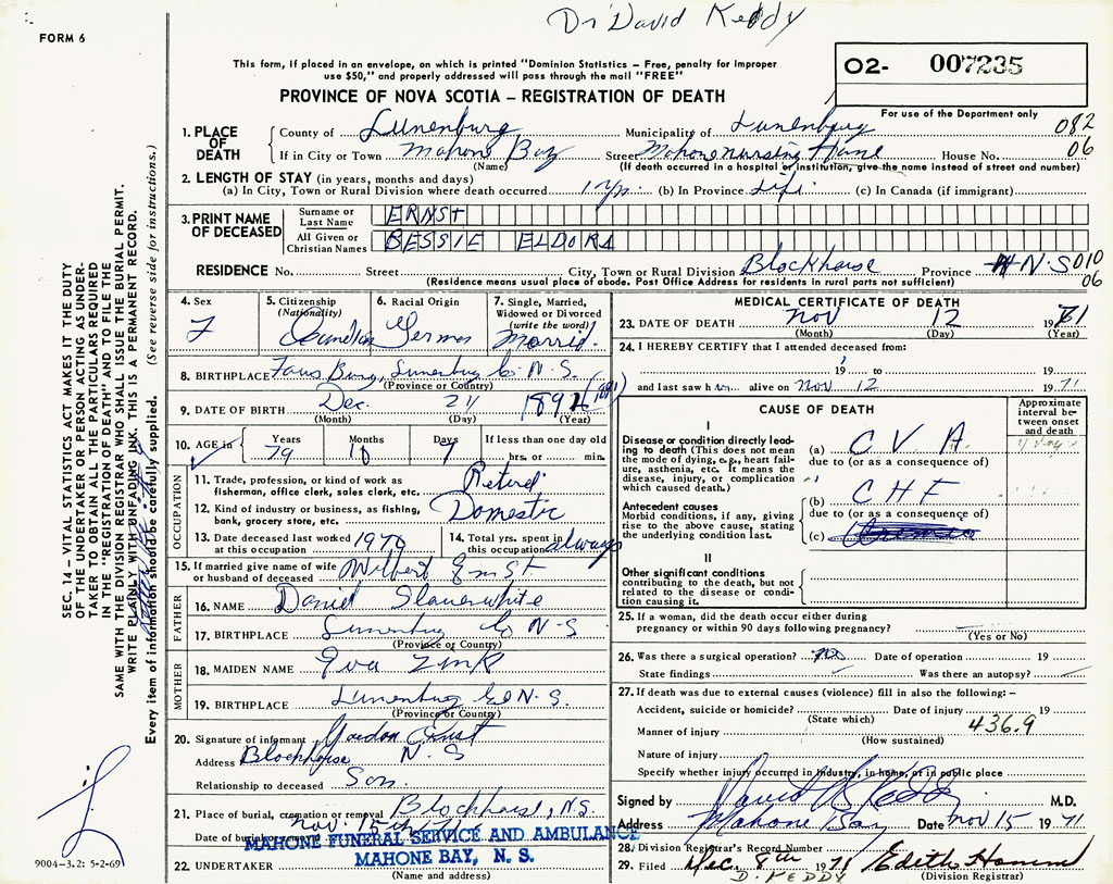 1. PLACE OF DEATH County of Lunenburg If in City or Town Mahone Bay