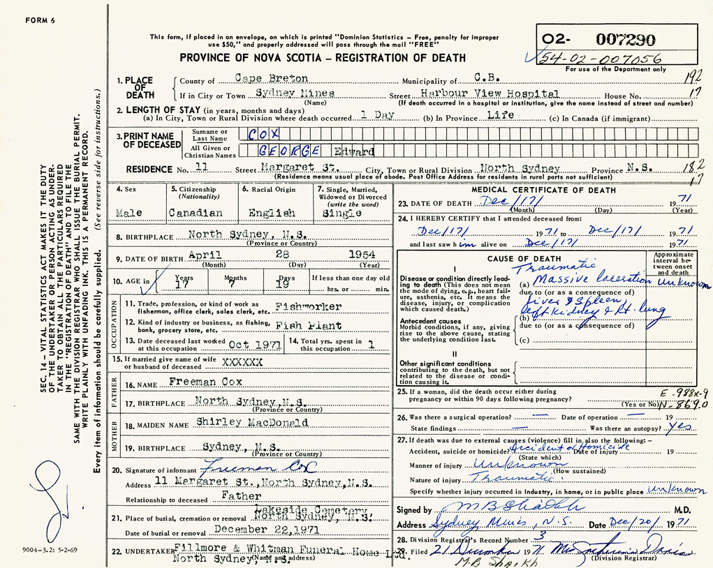 1. PLACE OF DEATH County of Cape Breton If in City or Town Sydney Mines
