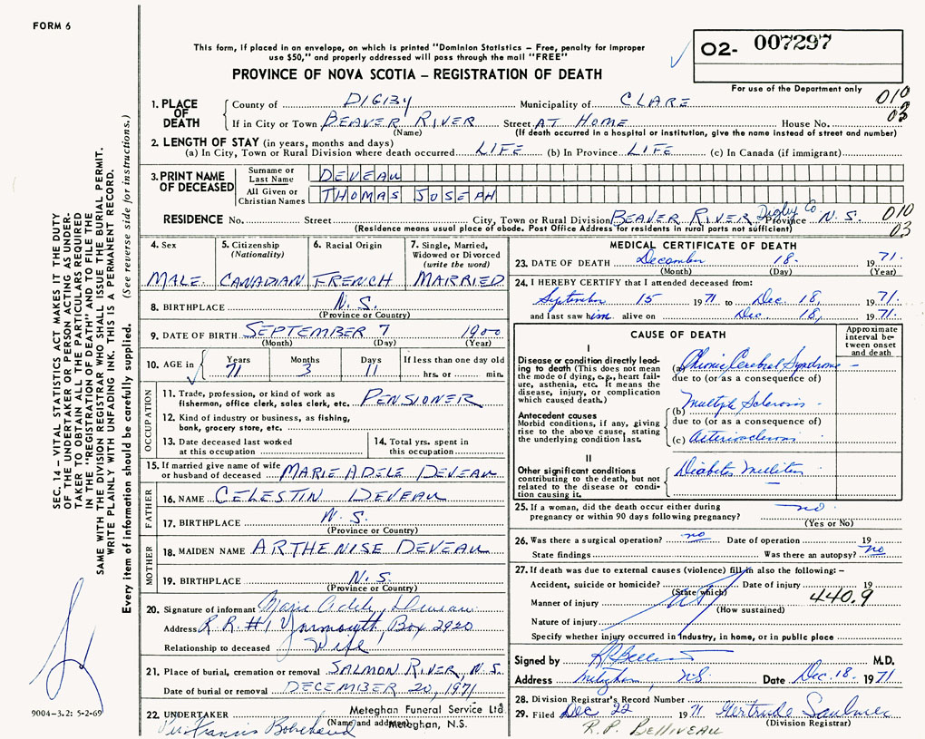 1. PLACE OF DEATH County of Yarmouth If in City or Town Beaver River
