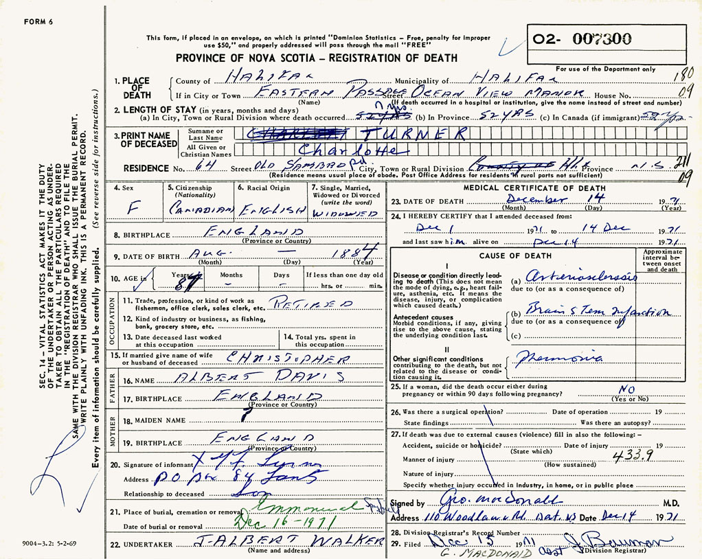 PROVINCE OF NOVA SCOTIA — REGISTRATION OF DEATH