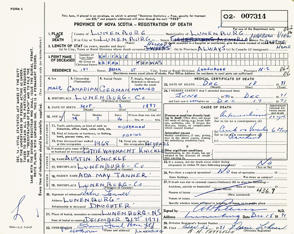 PROVINCE OF NOVA SCOTIA — REGISTRATION OF DEATH