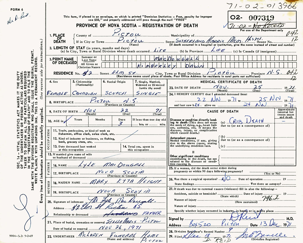 PROVINCE OF NOVA SCOTIA — REGISTRATION OF DEATH